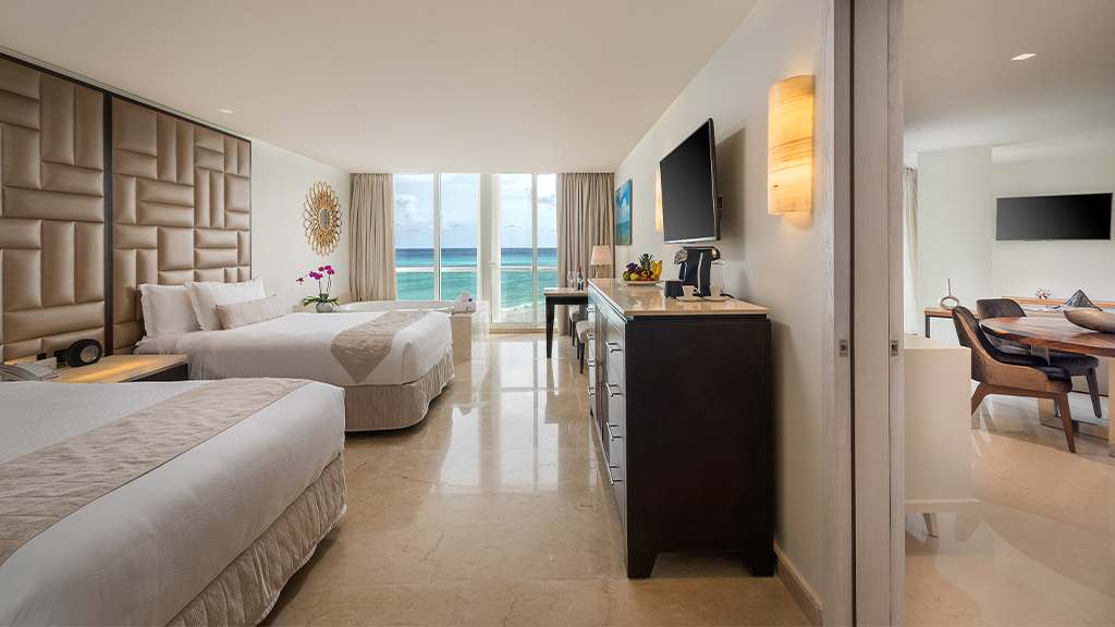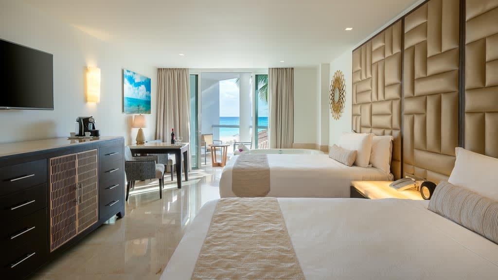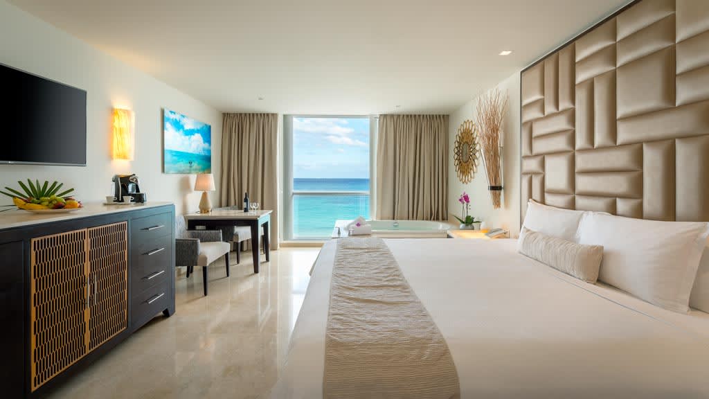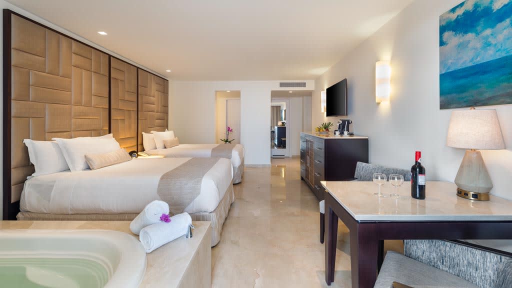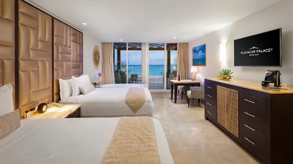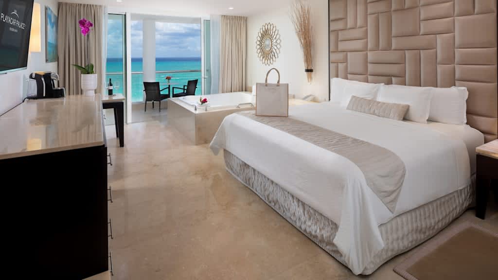 Nestled along the breathtaking shores of Riviera Maya, Playacar Palace offers chic beach getaways for guests of all ages. You can look forward to an unforgettable all inclusive experience with world-class dining, signature amenities and unparalleled service, all just minutes away from Playa del Carmen’s famous 5th Avenue. Spend your days soaking up the sun on the resort’s secluded stretch of white-sand beach with a cold cocktail in hand from the attentive wait service. Mini-vacationers will have a blast at the on-site kids club with exciting activities like mini Olympics, treasure hunts and more while you lounge by the sparkling pool overlooking the coast, with a section just for kids. The whole family can enjoy fun in the sun with resort activities like dance classes and biking tours, plus you can explore all the amenities and facilities at neighbouring Palace Resorts with Stay at 1, Play at 5! inclusions. Golf enthusiasts can tee off at the nearby golf course while those planning the ultimate relaxing getaway can treat themselves to a massage at the on-site spa ($). Embrace the local culture with a visit to 5th Avenue, Playa del Carmen’s lively downtown strip that’s lined with shops, bars, restaurants and nightclubs. When it’s time to grab a bite to eat, indulge in a host of delectable cuisines serving up something for all tastes from Teppanyaki to Shabu-shabu dining, Italian comfort foods and classic Texas-style barbecue. After the sun goes down, sip on a nightcap at one of the trendy bars dotted across the resort or take in a nightly live show before retiring to elegant accommodations that are spacious enough for the whole family, featuring a host of luxurious amenities like in-room Jacuzzis, mini-bars and more.