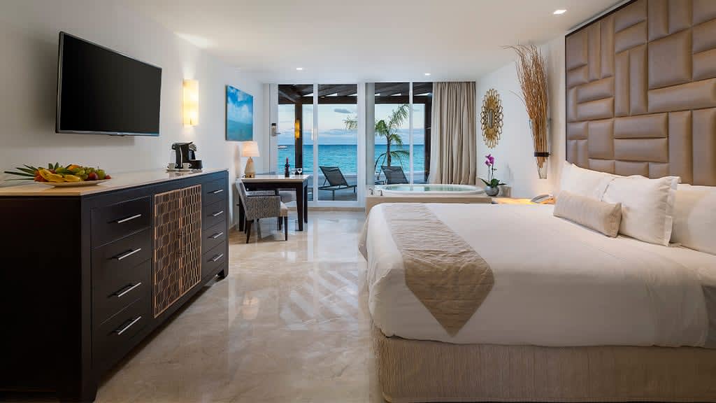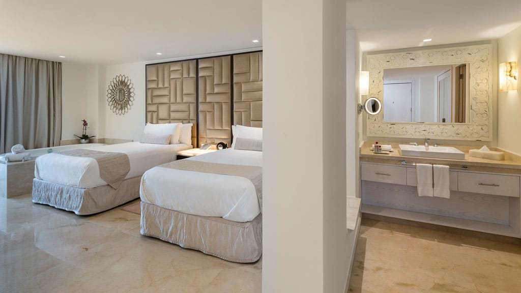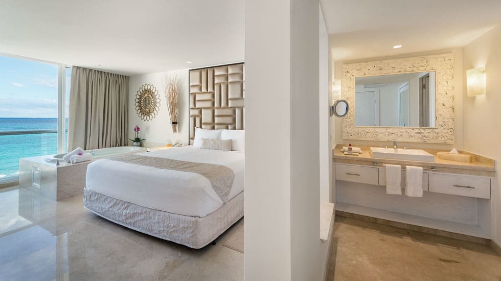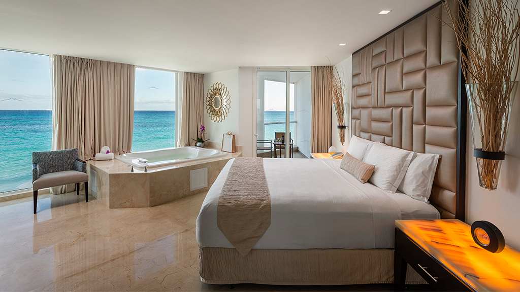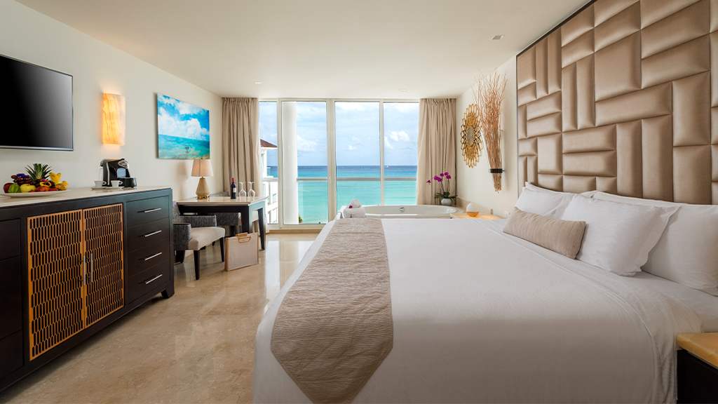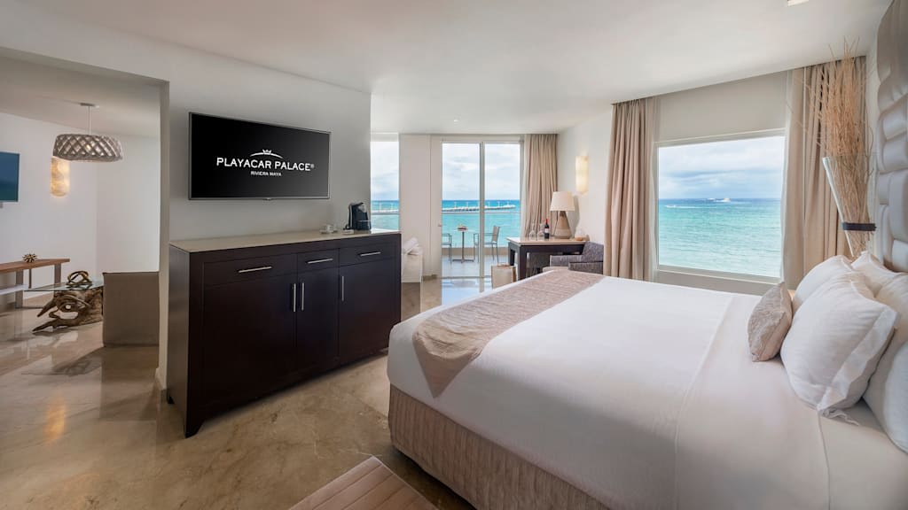 Nestled along the breathtaking shores of Riviera Maya, Playacar Palace offers chic beach getaways for guests of all ages. You can look forward to an unforgettable all inclusive experience with world-class dining, signature amenities and unparalleled service, all just minutes away from Playa del Carmen’s famous 5th Avenue. Spend your days soaking up the sun on the resort’s secluded stretch of white-sand beach with a cold cocktail in hand from the attentive wait service. Mini-vacationers will have a blast at the on-site kids club with exciting activities like mini Olympics, treasure hunts and more while you lounge by the sparkling pool overlooking the coast, with a section just for kids. The whole family can enjoy fun in the sun with resort activities like dance classes and biking tours, plus you can explore all the amenities and facilities at neighbouring Palace Resorts with Stay at 1, Play at 5! inclusions. Golf enthusiasts can tee off at the nearby golf course while those planning the ultimate relaxing getaway can treat themselves to a massage at the on-site spa ($). Embrace the local culture with a visit to 5th Avenue, Playa del Carmen’s lively downtown strip that’s lined with shops, bars, restaurants and nightclubs. When it’s time to grab a bite to eat, indulge in a host of delectable cuisines serving up something for all tastes from Teppanyaki to Shabu-shabu dining, Italian comfort foods and classic Texas-style barbecue. After the sun goes down, sip on a nightcap at one of the trendy bars dotted across the resort or take in a nightly live show before retiring to elegant accommodations that are spacious enough for the whole family, featuring a host of luxurious amenities like in-room Jacuzzis, mini-bars and more.