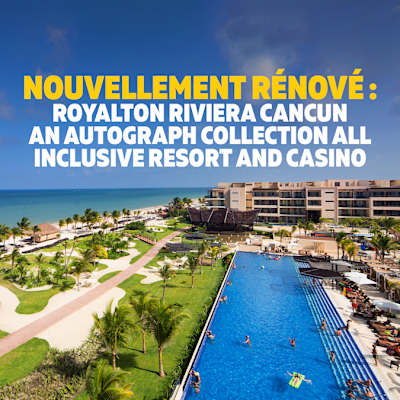 Certains hôtels font l’objet de quelques petites retouches. Le Royalton Riviera Cancun, lui, a été entièrement repensé. Cette propriété, qui rouvrira ses portes le 7 décembre 2025, a modernisé ses installations et rénové toutes ses chambres. Il s’agit d’une transformation complète offrant une expérience inédite à Cancún. Des restaurants rénovés aux hébergements réaménagés combinant confort et élégance, chaque détail a été conçu pour vous offrir des vacances que vous n’auriez même pas pu imaginer. Ne manquez pas la grande réouverture, réservez dès maintenant votre escapade transformée à Cancún.